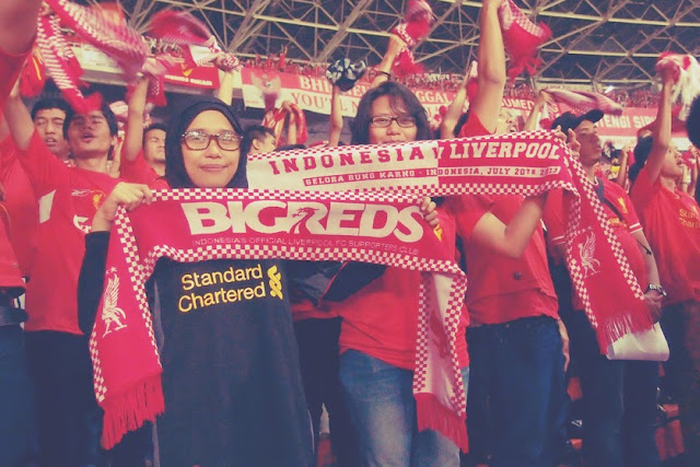 I like liverpool since my last year at primary school. That night I was watched tv with my cousin, EPL, liverpool match. When it was Steven Gerrard and Petter Crouch made 2 goals and the match end up with 2-0 for liverpool. Somehow I'm interested. First it because Gerrard then liverpool. I have no idea why. But let's admit it that Gerrard's look good and charming. It might be the one of "why" I like liverpool. Yes, their wise captain. StevieG. I'm not that liverpool fanatic fans actually, I just like liverpool. So much. I like the history behind liverpool, about hillsborough disaster. Okay well, I actually just want to share some photos. Few weeks ago liverpool came to Indonesia for their Tour. Me and my cousin were really excited about it. Then we decided to came and watched that match at GBK, Jakarta. My first time ever saw Gerrard directly. My God... He's overly handsome though I didn't look at him closely. I met Aat there, he's came from Bandung alone. He used travel to take him there. Yet the next day he had to follow some activities in his campus. What a fans! And we met some cousin's friends, they're liverpudlian. And we united here with Big Reds too. Fyi, I love the flares. Though it looked awful and the smoke hurt my eyes. And of course when we sang You're Never Walk Alone and when the whole people made the waves. Awesome!